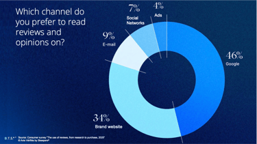 At first glance, this graph may seem counterintuitive to those who advocate for the integration of customer reviews into the advertising world. Only 4% of respondents cite advertising as their preferred channel for reading reviews, compared to 46% for Google and 34% for the brand’s website. Some will see this as a definitive condemnation: ‘Reviews have no place in advertising.’